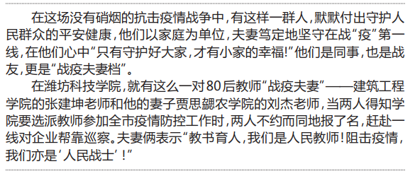 忙,成了他们那些天工作的主旋律。但即便再忙,他们也不放过一个细节,“我们做得细一些再细一些,就能让企业更安全。”张建坤说,他与妻子帮靠的企业相隔十多里地,早上7点出发,到晚上回家才能见面。在张建坤的眼里,妻子是个温柔娴静的小女人,但在疫情面前,她却成了一名坚强的战士。