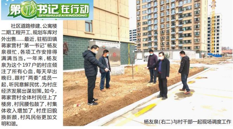 早在2018年,蒋家营村就结合美丽乡村建设,精心打造蒋营社区。杨友泉到村里后,跟村干部一起,跑手续、开动员会、协调施工等,一系列工作有条不紊地向前推进。群众有疑问,他们耐心解释;施工遇到问题,他们负责协调……终于,第一期6栋36000平方米公寓楼建成,197 户村民全部搬进楼房。