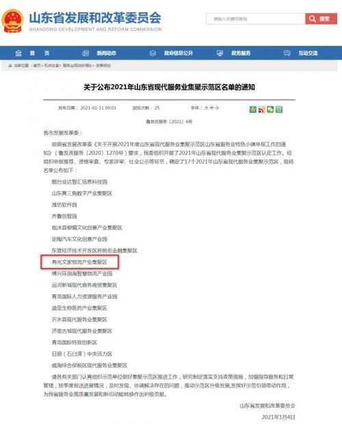 日前,山东省发展和改革委员会发布《关于公布2021年山东省现代服务业集聚示范区名单的通知》,确定了17个2021年山东省现代服务业集聚示范区,寿光文家物流产业集聚区位列其中。