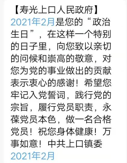 “2021年2月是您的‘政治生日’,在这样一个特别的日子里,向您致以亲切的问候和崇高的敬意,对您为党的事业作出的贡献表示衷心的感谢……”在党员“政治生日”之际发送祝福短信,是上口镇表达对党员关怀和爱护的特殊仪式,通过简单的“沟通与联系”,让党员切实感受到党组织的温暖,增强党员的荣誉感和归属感。