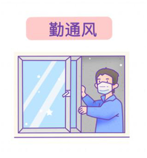 4、确保有效通风换气。温度适宜时,尽量采用自然通风加强室内空气流通。如使用集中空调,应在开启前检查设备确保运行正常,确保新风取风口与排风口之间保持一定距 离,对冷却塔等进行清洗,保持新风口清洁;运行过程中以最大新风量运行,加强对冷却水、冷凝水等卫生管理,定期对送风口等设备和部件进行清洗、消毒或更换。