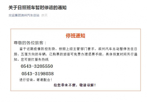 10月27日,记者从交运集团滨州汽车总站获悉,鉴于近期疫情防控形势,按照上级主管部门要求,滨州汽车总站暂停发往日照、五莲方向的车辆,已购票的旅客可免费办理退票手续,具体恢复时间另行通知。