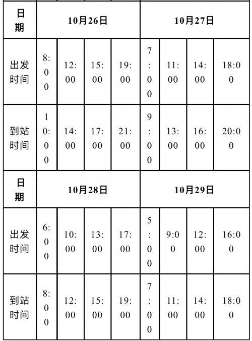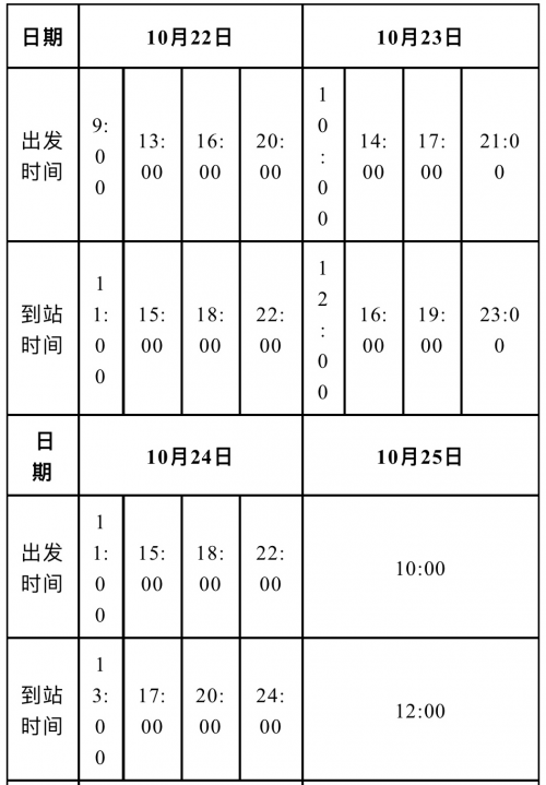 出租车运营时间:10月22-23日9:30-12:00、18:00-24:00;10月24日9:30-12:00;10月25日、27日、28日8:00-17:00;10月26日8:00-12:00 。