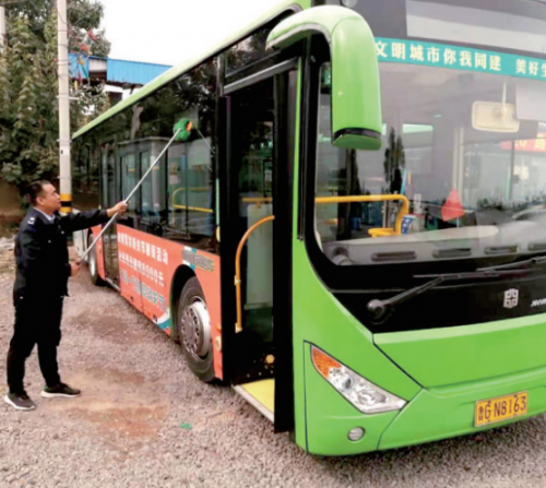 在9路公交车停靠点,记者看到,一辆送完乘客的公交车到站后,司机立即打开车门车窗通风,全面清扫车内卫生,随后在车厢内喷洒消毒液。