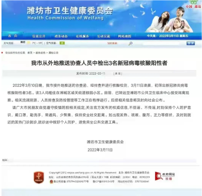 2022年3月10日晚,我市接外地推送的协查函,经排查并进行核酸检测,3月11日凌晨,初筛出新冠肺炎病毒核酸阳性者3名。该3人均租住在潍城区城关街道颐园小区。目前,已转运至潍坊市公共卫生临床中心接受隔离观察。相关流调溯源、人员排查及防控管理等工作正在有序进行。后续相关信息将及时向社会公布。
