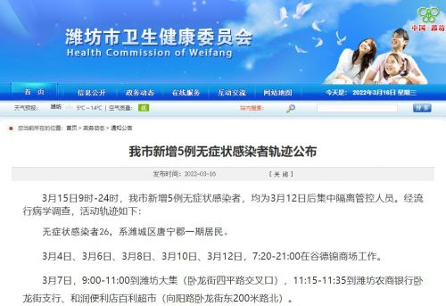 3月15日9时-24时,潍坊市新增5例无症状感染者,均为3月12日后集中隔离管控人员。经流行病学调查,活动轨迹如下: