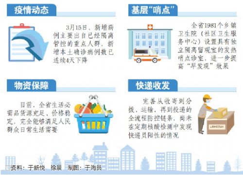 在疫情地区群众生活用品保价稳供方面,及时启动生活必需品每日监测机制,统筹确定356家重点保供企业,通过“线上点单、线下配送”等无接触模式,有力保障封控区、管控区生活用品供应充足、配送到位。在推进疫苗接种方面,各地积极动员、多措并举,持续高效推进群众疫苗接种,尽最大努力满足全人群接种的需要。截至3月15日24时,全省共接种新冠病毒疫苗2.45亿剂次,全人群接种率达到了90.24%。在邮政快递业疫情防控方面,抓住“人、物、环境”三个防范重点,完善从收寄到分拨、运输,再到投递的全流程防控链条。针对本轮疫情的新情况、新特点,紧盯传播链条,及时进行流调溯源、核酸检测、基因测序,加强分析研判,科学高效阻断传播风险。同时,精准划分封控区、管控区、防范区,严格落实各项管控措施。这几天的情况表明,这些新招实招硬招发挥了关键作用,也收到较为明显的效果。