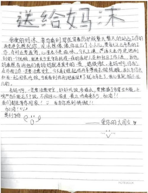 疫情防控责任大、任务重、时间紧,说不累是假的,但刘清霞说,再难也要咬牙坚持,不为别的,只因守土有责。“在信里,孩子说了很多加油打气的话,这是让我最感动的,她还说以有这样的妈妈而自豪,想着这些话,我感觉再辛苦都是值得的。”打开一直揣在口袋里的那封信,刘清霞告诉记者,为了能更好地做好疫情防控工作,家中1岁多的儿子已经提前断奶,说到这,她的眼眶又再次湿润了。
