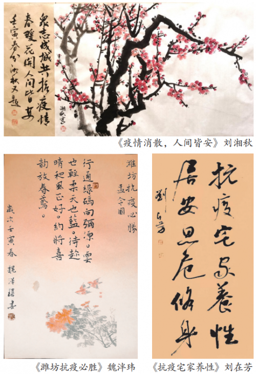 寿光市书法家协会积极开展疫情防控作品创作宣传工作,文艺工作者们用翰墨之香、艺术之美、传承之道用心用情书写抗疫之实、战疫之坚、胜疫之心,用厚重的笔墨为抗疫而书,为战疫贡献力量。魏泮玮、周月文、潘桄辉、董磊等会员第一时间创作出大量的书法作品,用精彩的笔墨,传递抗疫正能量。