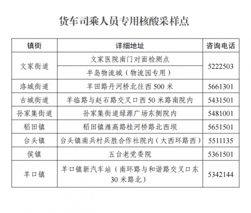 为满足货车司乘人员日常核酸检测需要,根据寿光实际,经指挥部研究决定,即日起在文家街道、文家半岛物流城、洛城街道、古城街道、孙家集街道、稻田镇、台头镇、侯镇、羊口镇共启用9个货车司乘人员专用核酸采样点(详细地址附后),请广大货车司乘朋友们就近到专用核酸采样点进行核酸采样。
