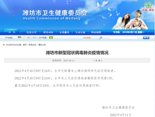 截至2022年4月10日24时,全市现有本土无症状感染者17例。