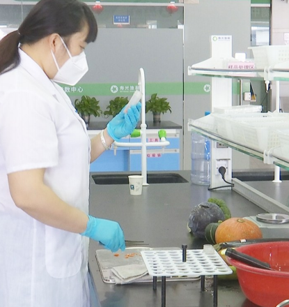 工作人员认真进行蔬菜质量检测