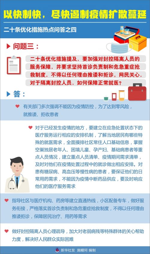 问题三:二十条优化措施提及,要加强对封控隔离人员的服务保障,并要求坚持首诊负责制和危急重症抢救制度,不得以任何理由推诿和拒诊。网民关心,对于隔离封控人员,如何保障正常就医?