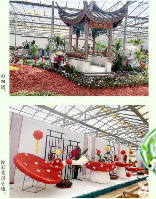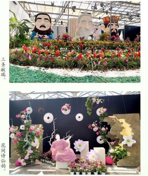 移步东厅“花样年华”版块,花卉艺术与生活美学在此交织。展区通过立体化的布置和生活气息的营造,提炼花卉的吉祥文化,打造“一花一世界”“花开富贵”等系列祥瑞花卉景致。景观“游春图”采用国潮萌宠的造型手法,以青绿山水为背景,雕塑唐马及人物形象,布置自然式花坛,将水体与花卉相结合,营造出“春风得意马蹄疾”的意境。景观“三圣献瑞”采用卡通的手法,以立体古诗书及立体文字为背景,雕塑寿光三圣人物造型,布置模纹立体花坛,花雕造型与花卉相结合,打造出灵动而富有历史气息的花场景观。