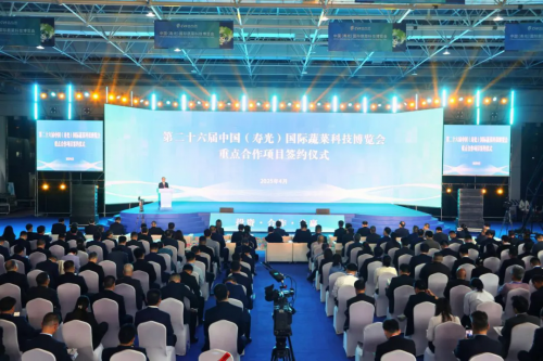 寿光融媒讯 4月27日,第二十六届中国(寿光)国际蔬菜科技博览会重点合作项目签约仪式举行。本次现场签署2个战略合作协议,集中签约18个项目、总投资达113.7亿元,涵盖新能源、新材料、高端装备、新一代信息技术等产业,将进一步推动寿光产业升级,为高质量发展注入强劲动力。中国检验认证集团山东有限公司党委书记、董事长、总经理董磊,浪潮智慧科技有限公司业务总监、浪潮(山东)农业互联网有限公司董事长韩磊,寿光市领导李鹏、赵天宝、武治强、袁世俊等出席签约仪式。