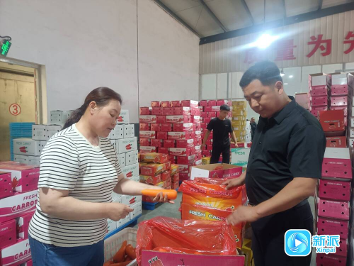 ▲寿光市正宏蔬菜有限公司负责人郑宁宁(右)对即将出口的胡萝卜进行把关