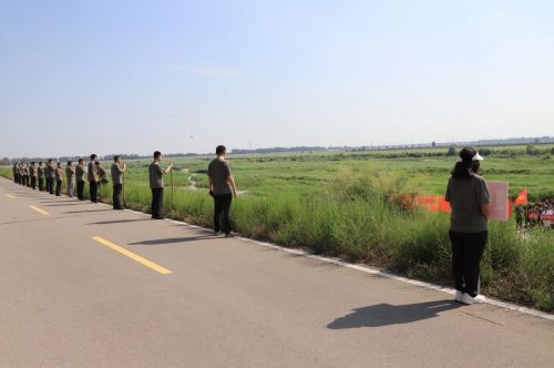 巡坝查险科目,20名巡逻队员在组长带领下,对阇黎院村、南袁家村等5村沿岸堤坝开展“地毯式”巡查,实时监测水位变化与堤坝安全,为防汛预警抢下先机。