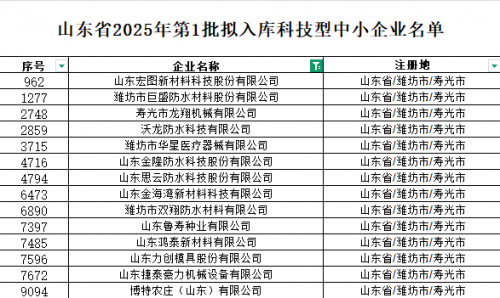 寿光融媒讯 近日,山东省科技厅公示了2025年第1批拟入库科技型中小企业名单。化龙镇山东宏图新材料科技股份有限公司、潍坊市巨盛防水材料股份有限公司、寿光市龙翔机械有限公司、沃龙防水科技有限公司等14家企业成功完成入库,现已通过公示。