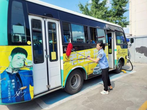 一天的营运结束后,时同玲的工作并未停止。她弯腰擦拭每一处座椅缝隙,俯身拖洗每一寸车厢地板,仔细清洁车窗、扶手、投币箱……一天下来,她的汗水几乎没有停止过,身上的工作服经常是湿了干、干了湿。车内环境打扫干净后,她又开始清理车体,细心洗去营运一日的风尘,让公交车以崭新的面貌迎接次日的运营。