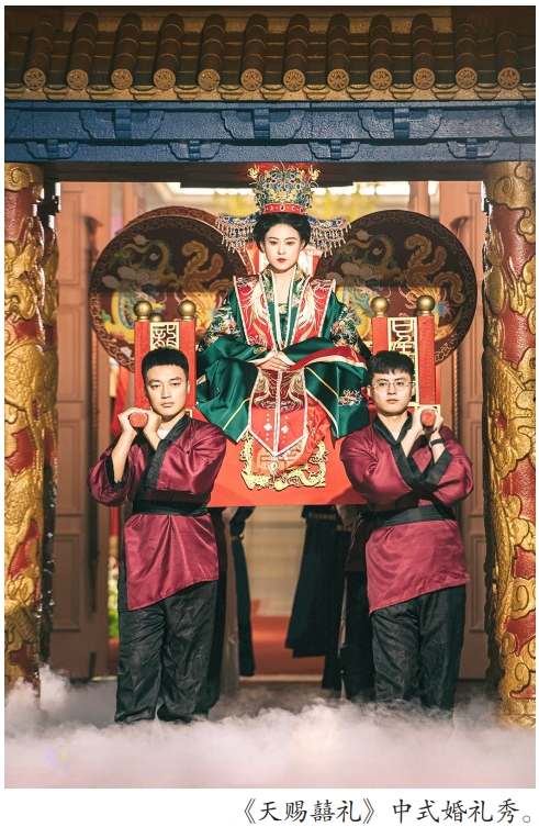 2019年,张滨团队策划举办了一场《庆余年》婚礼秀,严格参照《大明会典》规制,复原明代“亲迎礼”:新郎身着织金蟒袍行“奠雁礼”,新娘头戴点翠凤冠执“却扇礼”,连执事者手中的提灯都复刻古制。这场极具仪式感的婚礼秀震撼全场,也让寿光中式婚礼的咨询量迎来新高潮。2021年,张滨团队又策划举办了《天赐囍礼》发布会,汉制、唐制、宋制、明制等不同风格的中式婚服集中亮相,“合卺礼、却扇礼、跨鞍礼”等传统仪式轮番上演,300多位全国同行到场学习交流,近百位工作人员协同完成这场文化盛宴。一时间,这也成为行业学习的范本。
