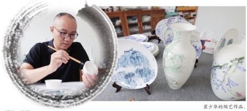 在素坯上作画与在宣纸上作画有着很大的不同,这些差异给崔少华的创作带来了一定挑战,也激发了他不断探索和创新的动力。“在宣纸上表现浓淡干湿的技法比较熟练,很容易掌握墨色。但画瓷是用釉料在泥做的素坯上画,这种釉料是颗粒状、很厚,如果用毛笔蘸上水再加上颜料,笔就比较‘糊’,不易下笔了。而且,陶胚吸水性强,行笔更需要精准掌握技巧。”他说,陶艺不只是一种艺术创作形式,更是一种心性修炼的历程。当把自己的思想情感、艺术观念,以及对生活的感悟,经由陶艺淋漓尽致地展现出来时,他觉得很有意义。