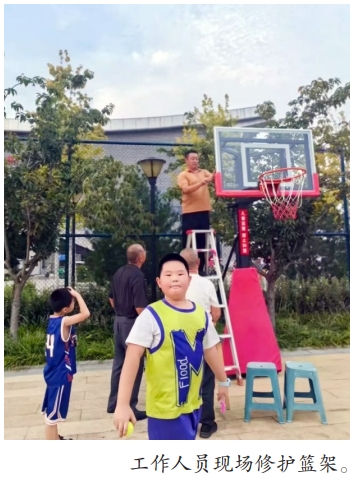 该工作人员迅速协调门卫人员协助处置:一人负责看护孩子并提醒路人远离危险区域,他与另一人则着手进行维修。他们随即取来梯子和维修工具,攀上篮球架进行紧固作业。经过十几分钟的紧急处理,篮板被重新固定,安全隐患得以排除,孩子们也很快重回球场活动。