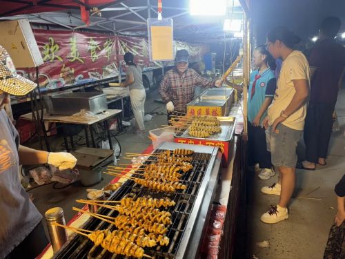 美食区同样人头攒动,当地特色小吃琳琅满目,散发着诱人的香气。一串串大面筋在炭火上烤得滋滋作响,鲜嫩的鱿鱼须在铁板上翻炒,各种果干也摆满了摊位,香气四溢,让人回味无穷。