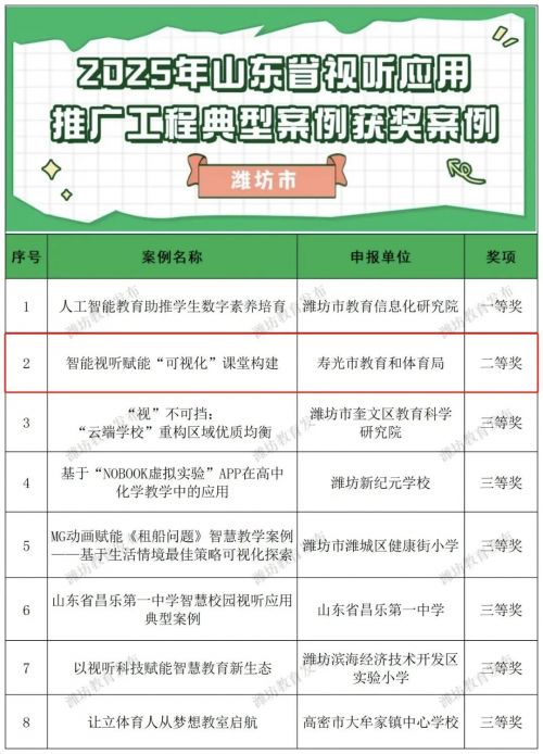 【潍坊寿光】省级名单公布!寿光智慧教育案例入选 2025-09-16 10:16 字号: 近日,山东省广播电视局、 山东省教育厅等9个部门公布了 2025年山东省视听应用推广工程 典型案例征集活动获奖名单 全省共有17项基础教育案例获奖 其中寿光市1项