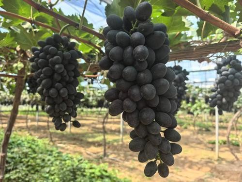 “这个品种最特别的是颜色,成熟之后会泛起一层深紫色的果霜,就像蓝莓一样,所以才有了‘蓝莓葡萄’这个名字。”谈及精心培育的“蓝莓葡萄”时,李兰英眼中透着欣喜与自豪。她表示,蓝莓葡萄在市场上并不常见,属于进口品种。它的颜色和果实与夏黑葡萄相似,但口感更甜。