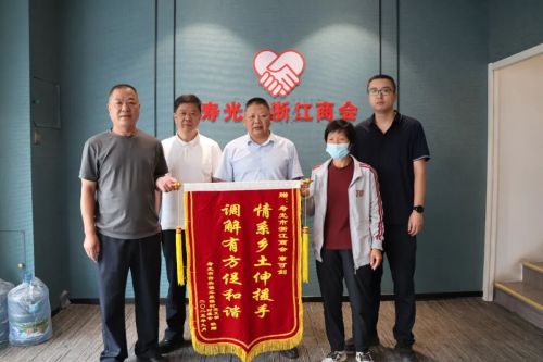 寿光融媒讯 近日,三座楼村一村民将一面印有“情系乡土伸援手,调解有方促和谐”的锦旗,送到了潍坊寿光市浙江商会章可剑的手中,以此表达对浙江商会的诚挚谢意。这一暖心举动,是台头镇探索多元化矛盾纠纷调解机制的一次有效实践,也成为我镇在基层社会治理中的一道亮丽风景线。