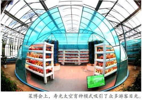 为了让游客更直观了解“航空育种”的场景,在菜博会10号馆北侧,寿光市设立专区,把航天育种的模式向游客展示。在这里,两个“太空舱”模拟了太空宇宙中强辐射、微重力、高真空、交变磁场等特殊环境,充分利用人工补光技术、无土栽培技术、环境智能控制技术等模拟作物生长所需的水、阳光以及温度等生长条件,展示在太空极端条件下利用人工创造的环境种植蔬菜的场景。