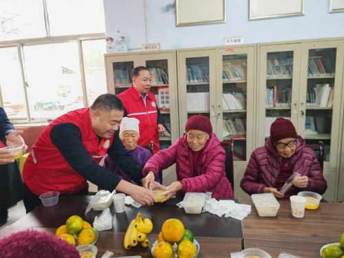 活动现场,寿光市口腔医院为老年人提供量血压、测血糖、口腔检查等义诊服务,人大代表和社会爱心人士为老年人捐赠棉被、水果等爱心物资。当热腾腾的饺子出锅时,人大代表给每位老人都盛上一碗饺子,同时还给每位老年端上热乎乎的小米粥,为老年人分发碗筷、分发水果,忙的不亦乐乎。老年人开心的享用美味的饺子,脸上都洋溢着幸福的笑容。