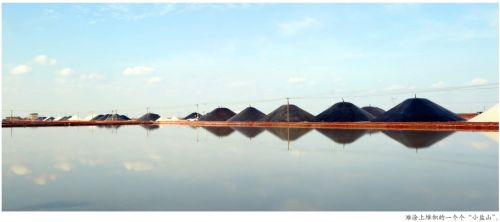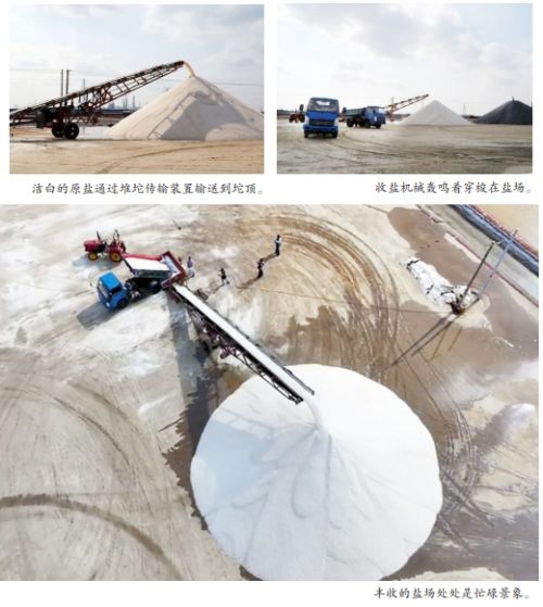 不远处,收盐车轰鸣着往返作业,湛蓝天空下,广袤的结晶池泛着粼粼波光,原盐通过堆坨传输装置源源不断地输送到坨顶,落在滩涂上堆积成白色的“小盐山”。