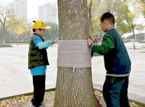 小志愿者在给大树制作“毛衣”