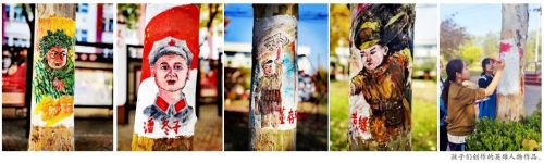 活动前,班主任通过主题班会讲述英雄事迹,引导学生了解不同时代英雄的奉献故事;美术老师则现场指导绘画技巧,确保创作既尊重树木生长规律,又兼具艺术表现力。活动现场,孩子们分组协作,或勾勒轮廓,或调配色彩,或细致填涂。有的学生用稚嫩的笔触画出邱少云烈火焚身仍坚守潜伏的坚毅身影,定格英雄不屈瞬间;有的学生用坚毅的笔触绘出董存瑞手托炸药包冲锋的果敢身姿,铭记英雄无畏壮举;有的学生用坚定的笔触勾勒黄继光挺胸堵枪眼的凛然形象,彰显英雄报国决心;有的学生用灵动的笔触画出王二小引敌入埋伏圈的机智身影,定格少年英雄风采……原本单调的树干渐渐披上“英雄外衣”,成为校园中独具特色的红色文化景观。