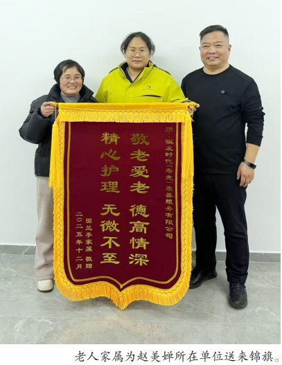 寿光融媒讯(首席记者 郑小菲)“敬老爱老 德高情深 精心护理 无微不至”,日前,一面饱含深情的锦旗被送到了银发时代(寿光)康养服务有限公司(以下简称“银发时代康养公司”)居家护理员赵美婵手中。送锦旗的是圣城街道东关村田爷爷的家属,这短短16个字,不仅是对赵美婵贴心服务的由衷认可,更是对居家养老服务的高度肯定。