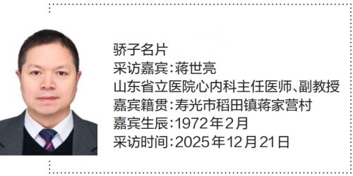 如今的蒋世亮,已成为冠心病、高血压病、心力衰竭、心律失常等疾病诊断治疗的权威专家,尤其擅长冠心病介入性诊断与治疗。他以第一作者和通讯作者公开发表论文20余篇,其中SCI收录6篇,中华医学系列杂志6篇;主持山东省科技攻关课题1项,参与国家自然科学基金课题1项(第二位),荣获国家实用新型发明专利1项、山东省医学科技奖三等奖2项,用科研成果为临床实践赋能。同时,他还身兼中华医学会山东省分会心衰组委员、山东疼痛医学会胸痛医学专业委员会副主任委员等多项学术职务,在行业内赢得广泛认可与赞誉。