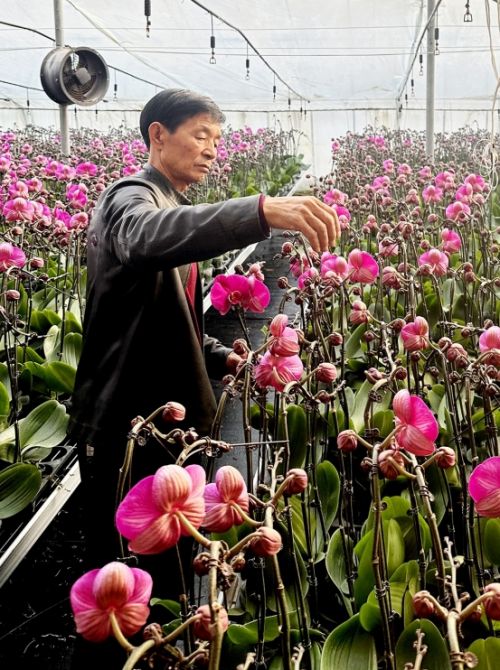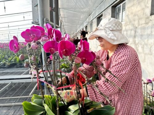 1月25日,记者走进盛芳花卉占地18000多平方米的种植基地,8个现代化温室大棚内绿意盎然、花香四溢,110个蝴蝶兰品种争奇斗艳。特别是大辣椒、满天红、宝贝、安娜、光芒、藏宝图、温文尔雅、恭喜发财等特色品种琳琅满目,不同尺寸、花型的植株错落有致,满足了不同消费者的选购需求。“我从2009年开始培育蝴蝶兰,有着十几年的种植经验,精细化、科学化的培育管理,让我们把植株损耗率控制在5%以内。”基地负责人林春富说。