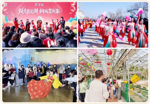 图①、②:巨淀湖春节期间各类活动场景。图③:极地海洋世界现场表演场景。图④:寿光市蔬菜高科技示范园众多游客参观场景。