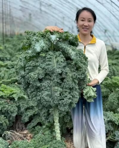2025年,郭芋辰与丈夫胡建伟瞄准特色功能蔬菜赛道,将发展目光投向“长寿之乡”广西巴马,开启了羽衣甘蓝规模化种植之路。郭芋辰介绍,这种从荷兰引进的十字花科蔬菜,营养密度高,富含膳食纤维与多种抗氧化成分,低热量、高营养,堪称蔬菜界的“营养宝库”,在健康消费市场备受青睐。