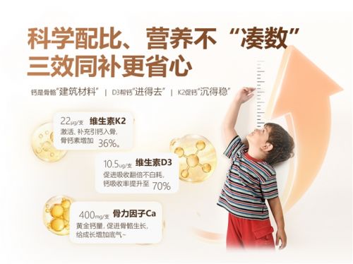 专利维生素D3高效打通肠道钙质吸收通道,激活身体对钙离子的吸收能力,大幅提升钙质整体利用率,彻底解决普通钙剂“补得多、吸得少、钙质白白流失”的无效补钙难题;专利维生素K2(MK-7)则发挥钙质定向搬运作用,精准引导血液中游离钙质沉积至骨骼部位,减少钙质随代谢流失,同时避免钙质在血管、软组织异常沉淀。