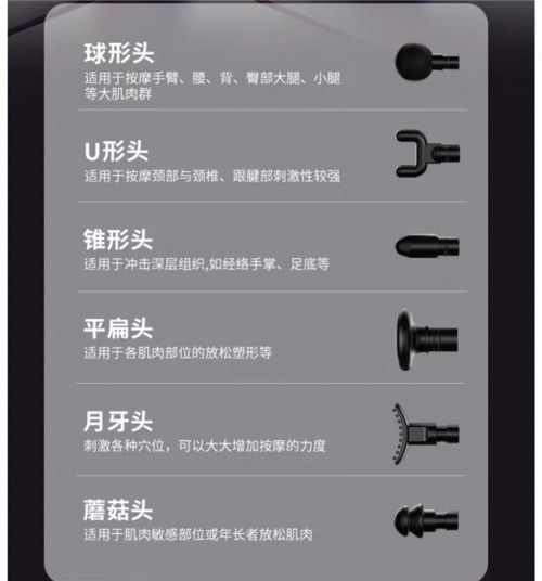 6款专业按摩头,覆盖全身放松场景 标配6款不同功能的专业按摩头,每一款都针对特定肌肉部位精准设计,实测无需额外购买配件,就能满足全身不同部位的放松需求,适配多场景使用: