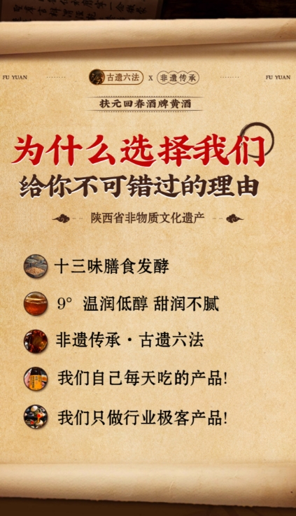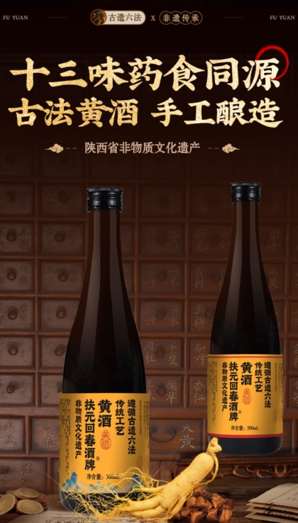 扶元回春酒牌黄酒的饮用场景较为灵活,可完美融入日常工作与生活的各个场景,满足不同消费者的多样化需求。在日常养生场景中,早餐后适量饮用,可调理脾胃、开启元气满满的一天;晚餐后饮用,能够帮助消化、缓解一日的疲惫;睡前半小时温饮,可安神助眠,提升睡眠质量。在季节适配场景中,秋冬季节温饮,可驱寒暖身、滋养气血,帮助人体抵御寒冷;夏季冰镇后饮用,可清爽解暑、沁人心脾,实现四季适配饮用。在社交场景中,亲友小聚时,可替代高度酒,温润不醉人,兼顾社交氛围与养生需求;节日送礼时,依托非遗工艺加持与大气的包装设计,既具仪式感,又有养生价值,适用于赠送长辈、亲友、同事。此外,该产品还可用于烹饪,如制作黄酒炖乌鸡、阿胶黄酒蛋等菜肴,既能提鲜增香,又能融入养生理念,提升饮食的营养价值。