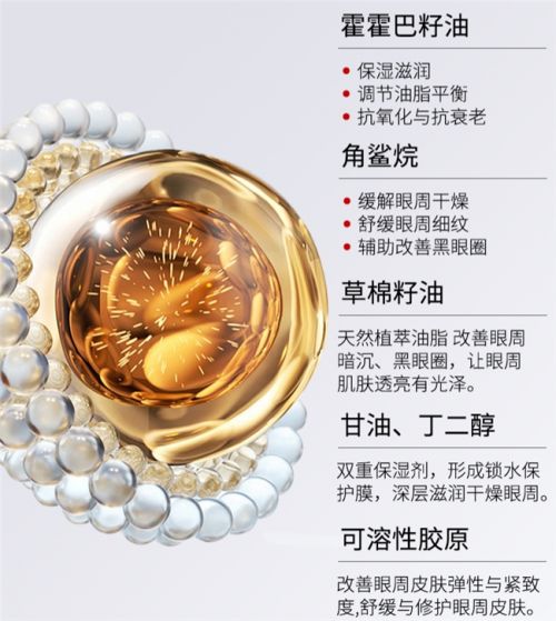兼顾抗糖与紧致,针对松弛和暗沉,对眼袋下垂和眼周发黄有一定调理效果,适合轻熟龄肌。