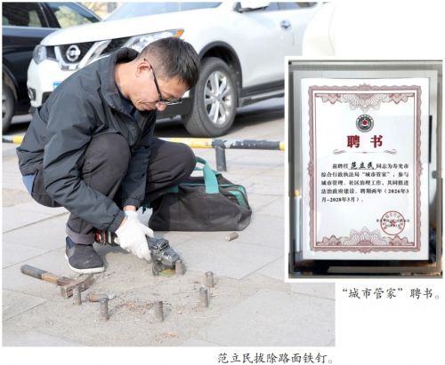 寿光融媒讯(见习记者 付艳茹)在渤海路和圣城街道附近的路边、小区车位旁和仓圣公园周边,经常能看到一个手握切割机,蹲在地上专注清理路面遗留“钉子”的身影,他就是圣城街道沙阿村村民范立民。四个月来,他在路面清理了近800颗铁钉(片),用双手默默守护市民脚下安全,不仅被大家赞为“寿光好心人”,还被城市综合行政执法局聘为“城市管家”。