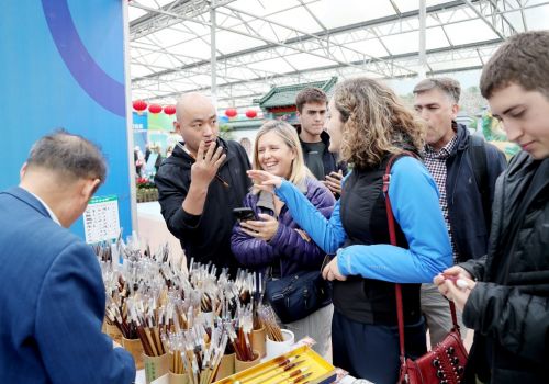 寿光融媒讯(记者 高斌)在菜博会6号馆“潍坊好品”展区,文化气息浓郁,客商云集。几位金发碧眼的国际友人流连于一处毛笔展位前,经过一番精心挑选,最终各自购得心仪的毛笔,满意而归。